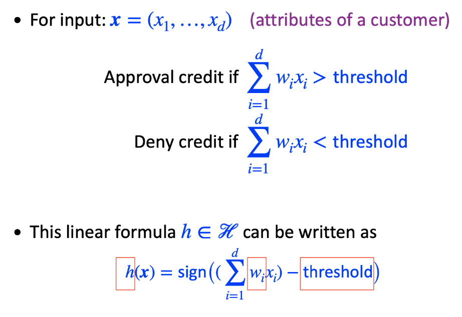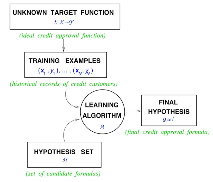 - 最终假设 ():学习算法的输出是最终的假设,它是一个函数,旨在近似未知目标函数 ()。 在图中,这被称为“最终的信用审批公式”,表示它是一个近似于理想信用审批函数的模型。