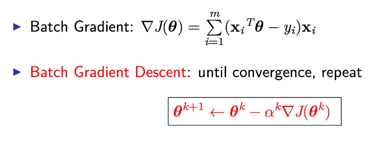 Batch Gradient 批量梯度是指在梯度下降法中,使用整个训练数据集来计算损失函数的梯度。 m是训练样本的总数 xᵢ是第i个样本的特征向量 yᵢ是第i个样本的标签 θ是模型参数向量 xiTθ 表示预测值 根据误差,向特征向量方向来调整 BGD:αk 代表学习率